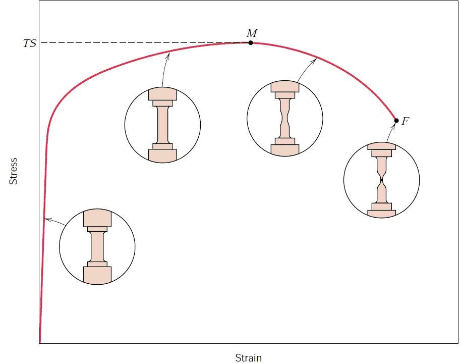但實際上,從前一張圖上就可以看出,拉伸變形是有頸縮的,因此單純的比例關系意義是不大的,因而由此繪出的圖也可能給人帶來一些容易產生誤解的信息,比如讓人誤認為過了M點金屬材料本身的性能會下降。但其實我們可以看到,在斷口處A(這個面積才代表真正的受應力面)是非常小的,因而材料的真實強度時上升了的(是指單位體積或者單位面積上的,不是結構上的)。