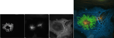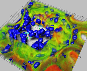Composite image derived from16 Z-stack sets from 3 fluorescent channels. Image courtesy of Richard Cole, Wadsworth Center, Albany, NY. |