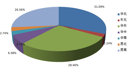 華東、華北、西南三足鼎立,分別占據全國總份額的28.46%、31.09%、26.36%,總產量占有85.91%